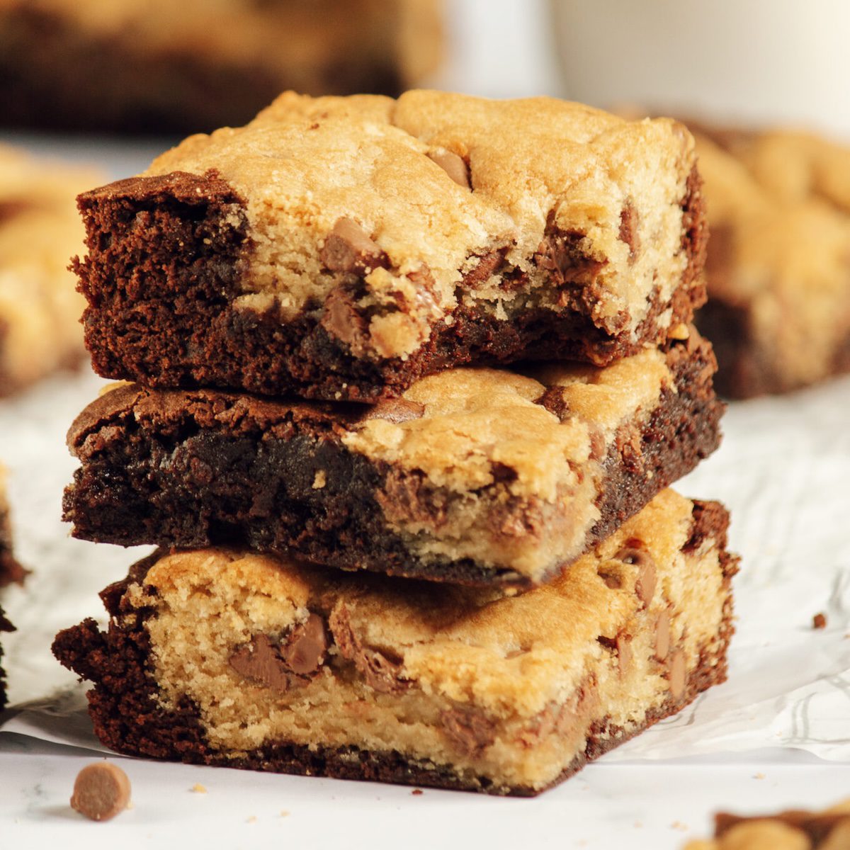 The ultimate fusion: a rich, fudgy brownie layer meets a soft, chewy chocolate chip cookie – all in one irresistible treat.