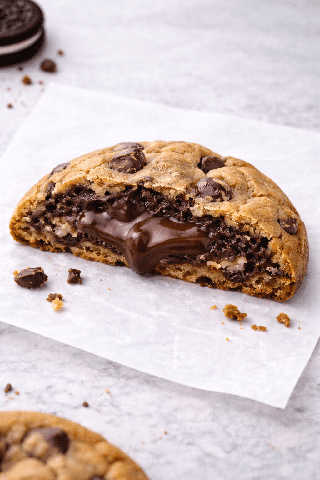 A rich, buttery chocolate chip cookie with a hidden heart of smooth, decadent chocolate ganache – pure bliss in every bite.